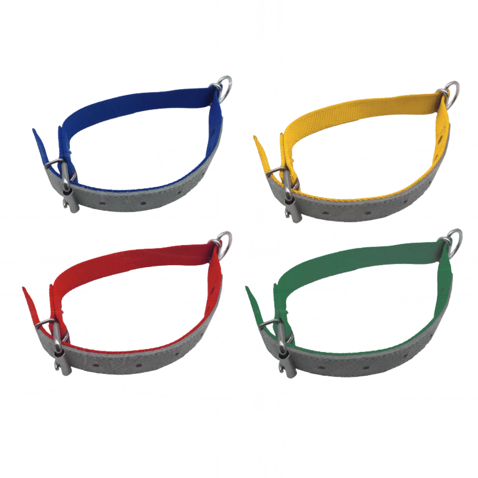 Robuster, lederverstärkter Halsriemen für Schafe mit D‑Ring in Rot, Gelb, Grün oder Blau. Länge ca. 65 cm, Breite ca. 3 cm – ideal zum Kennzeichnen, Führen und Befestigen von Glocke oder Marke.