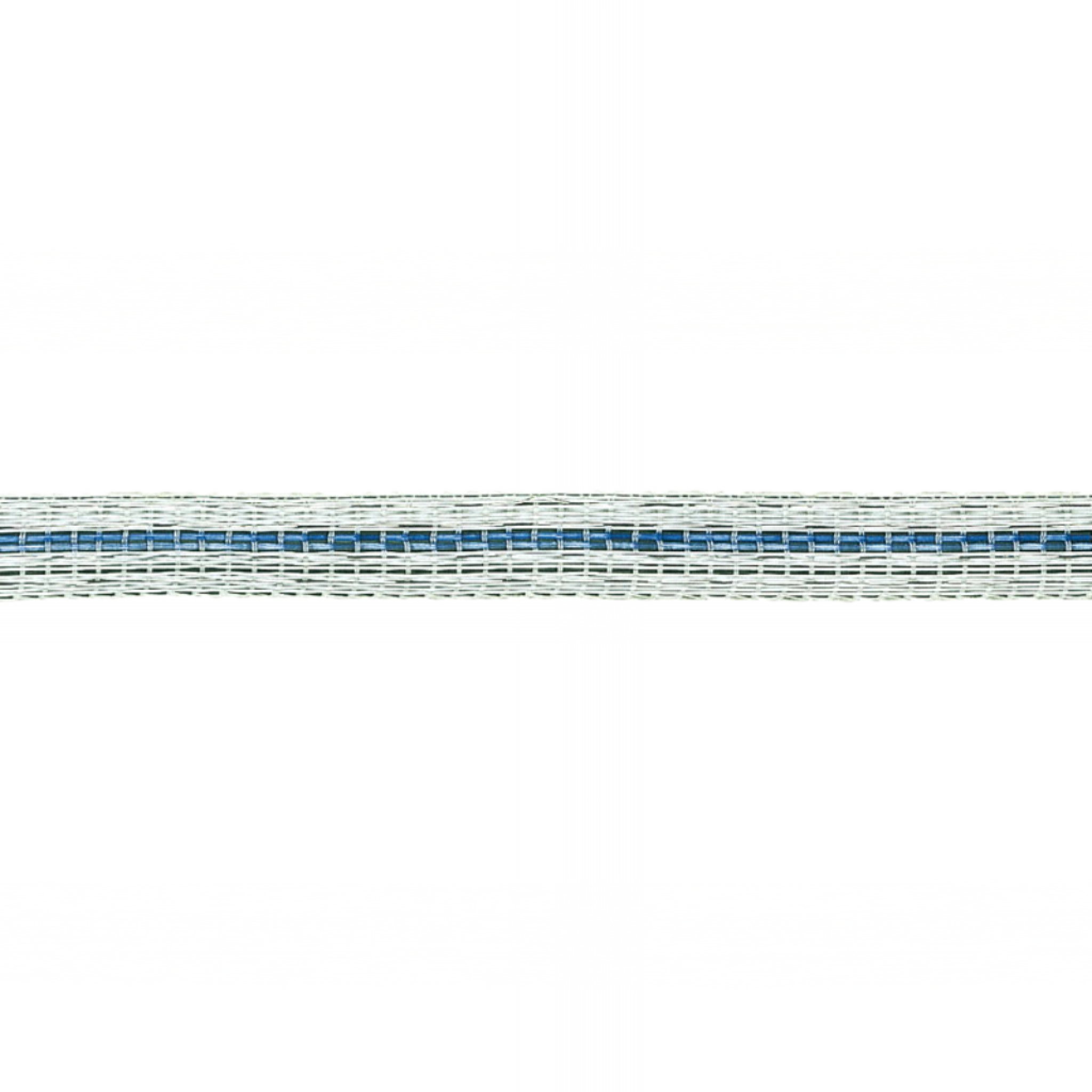 Hochleitfähiges Weidezaunband in Weiß mit blauem Faden, 4 Edelstahldrähten (0,20 mm), 10 mm Breite, 200 m Rolle – ideal für sichere Weidezäune.