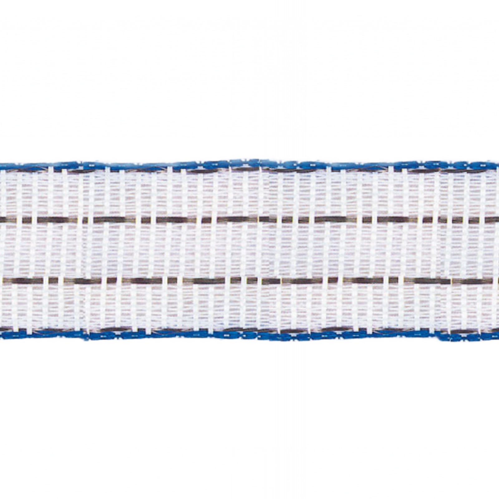 | Material/Farbe | Kunststoffband, weiß mit blauen Akzentfäden |