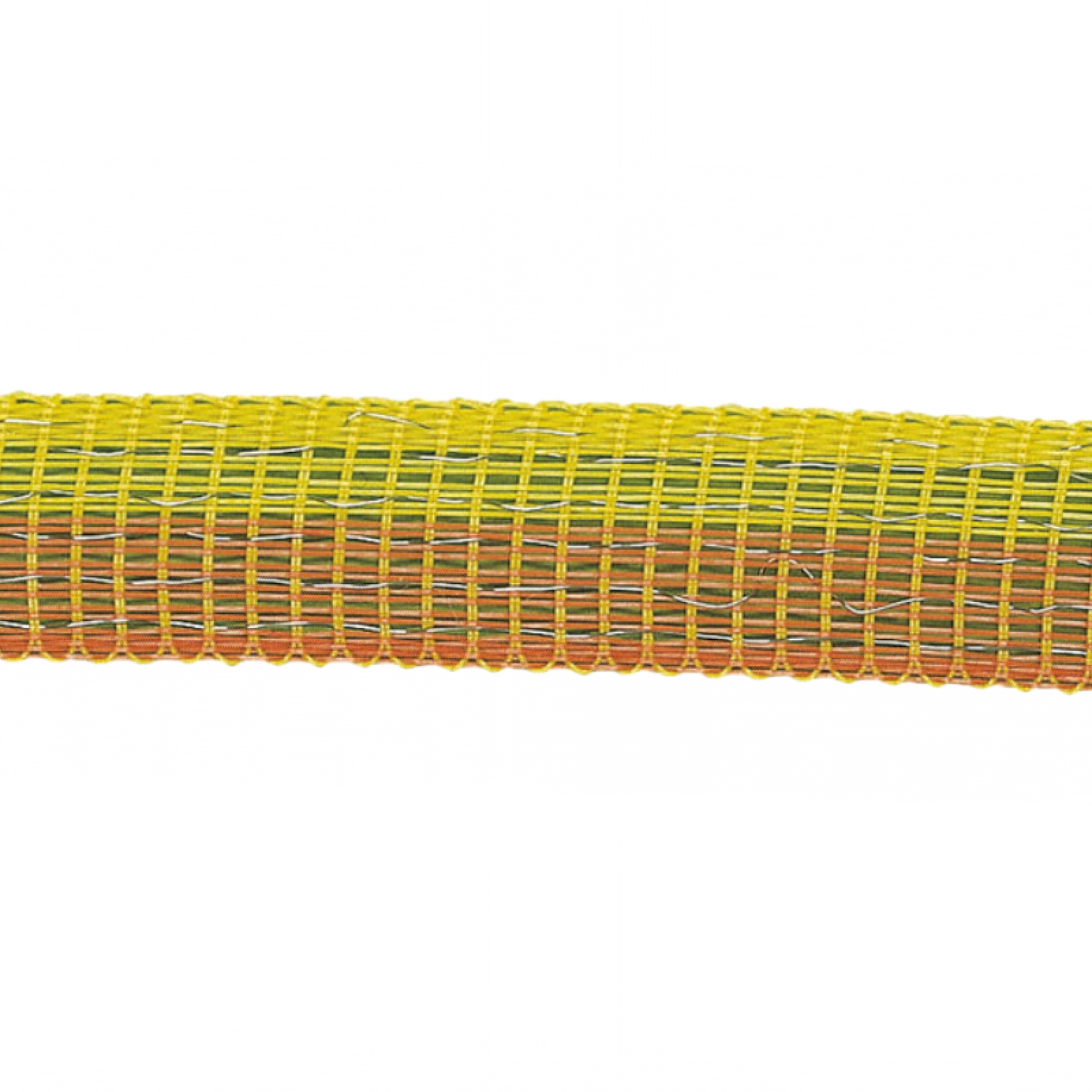 Robustes Weidezaunband in Gelb/Orange mit 6 Edelstahlleitern für optimale Leitfähigkeit und hohe Reißfestigkeit.