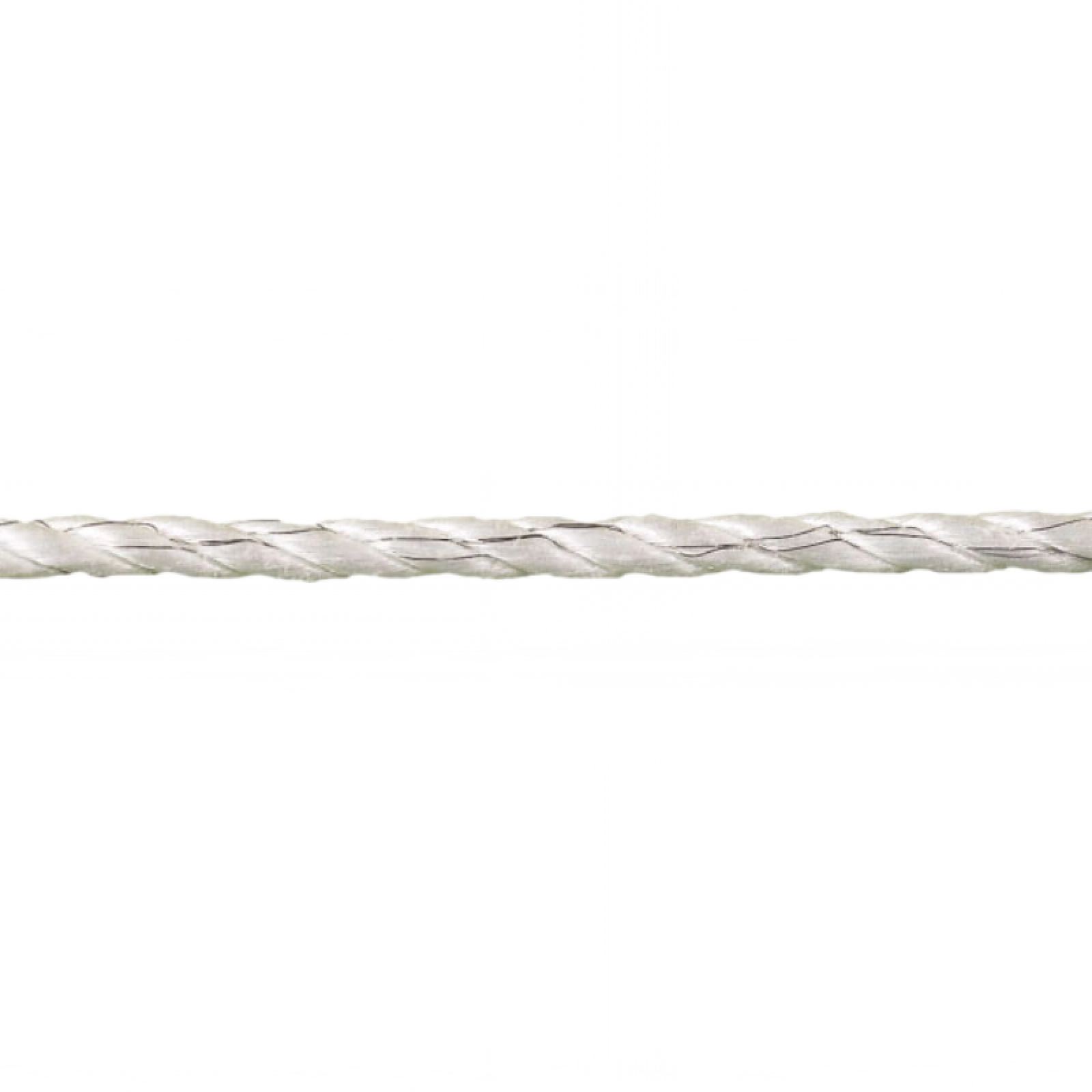 Weiße Weidezaunkordel mit 6 Edelstahlleitern für optimale Leitfähigkeit, ca. 6 mm Durchmesser, 200 m Rolle, UV-stabil für ca. 3 Jahre.