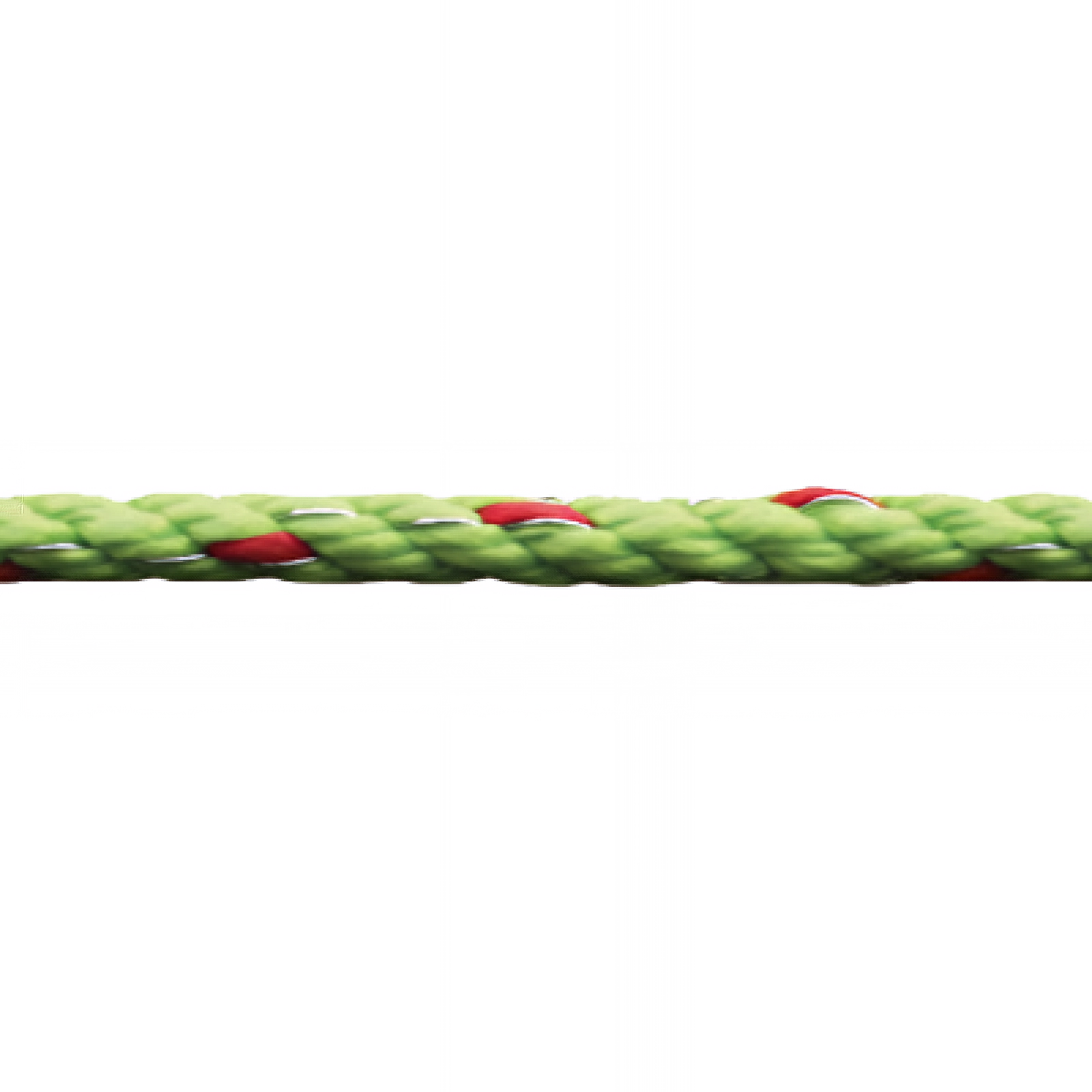 Robuste Weidezaunkordel WZ 67 in grün/rot mit 3 Edelstahlleitern (0,4 mm Ø) für optimale Leitfähigkeit. 200 m Rolle, Ø 5 mm, hohe Reißfestigkeit (490 kg).