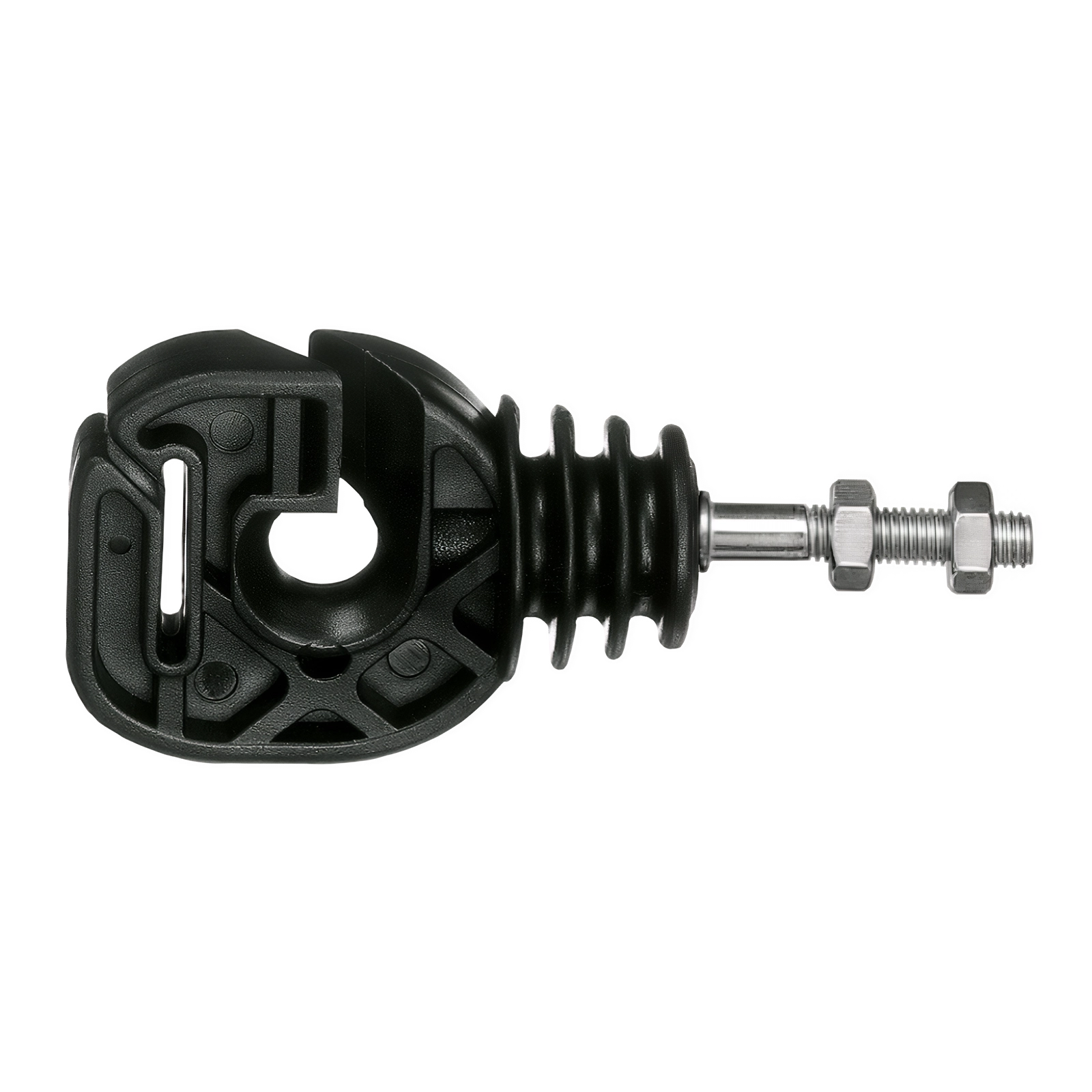 Isolateur robuste pour clôture électrique, adapté au ruban jusqu’à 20 mm et au fil, conducteur ou corde jusqu’à 8 mm Ø. Avec filetage M6 et deux écrous pour une fixation sûre.